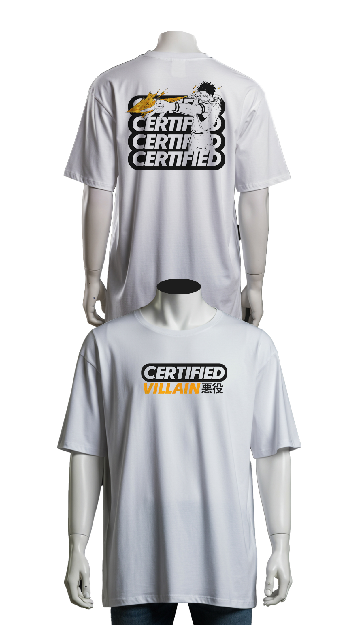 Oversized Jujutsu Kaisen anime streetwear tee with Sukuna-inspired character back graphic and bold 'Certified Villain' front print with Japanese kanji. Premium cotton, black and white editions.