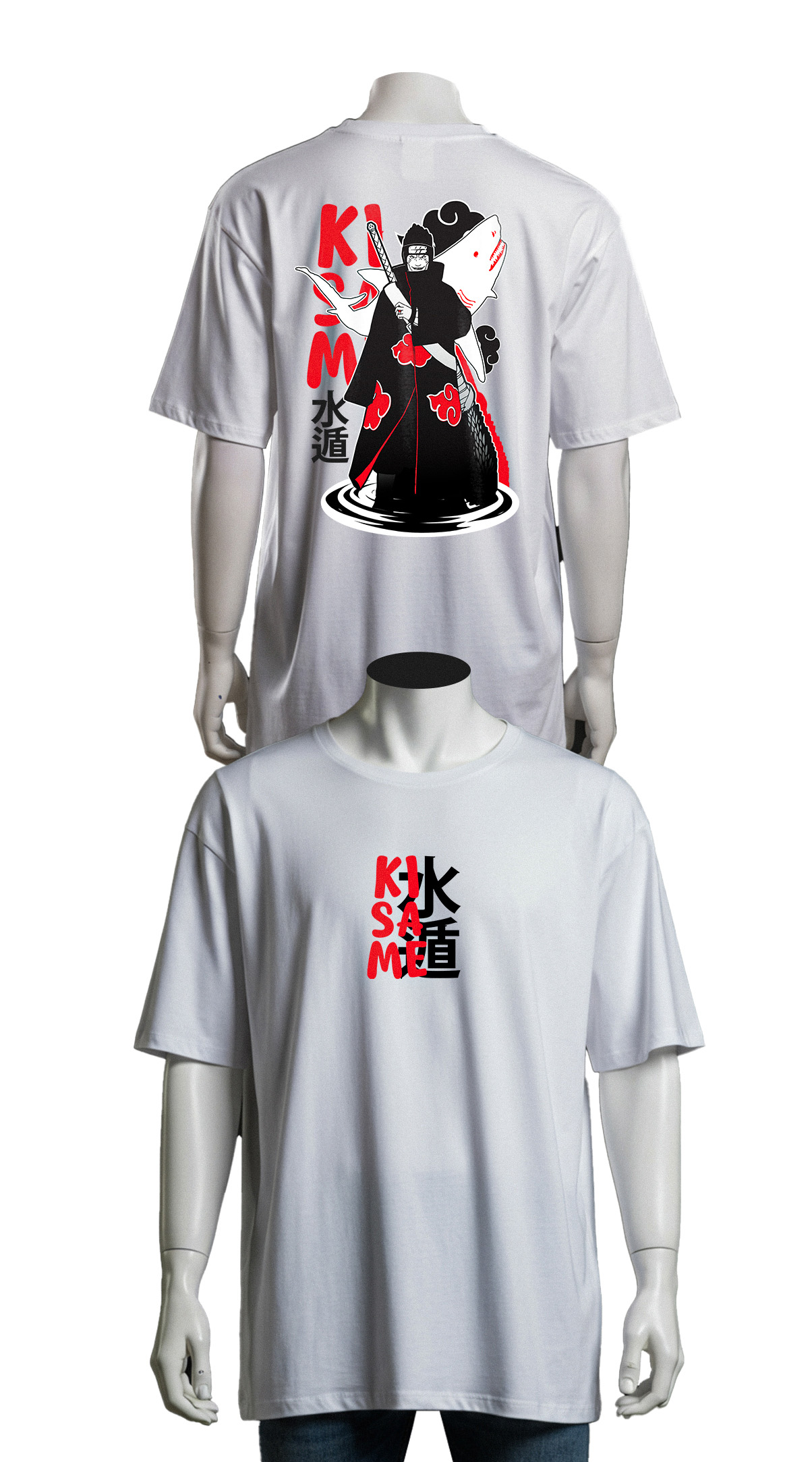 Oversized Naruto-inspired streetwear tee with Kisame Hoshigaki full back print, Samehada sword and Japanese kanji. Bold red and black anime graphic on premium cotton.