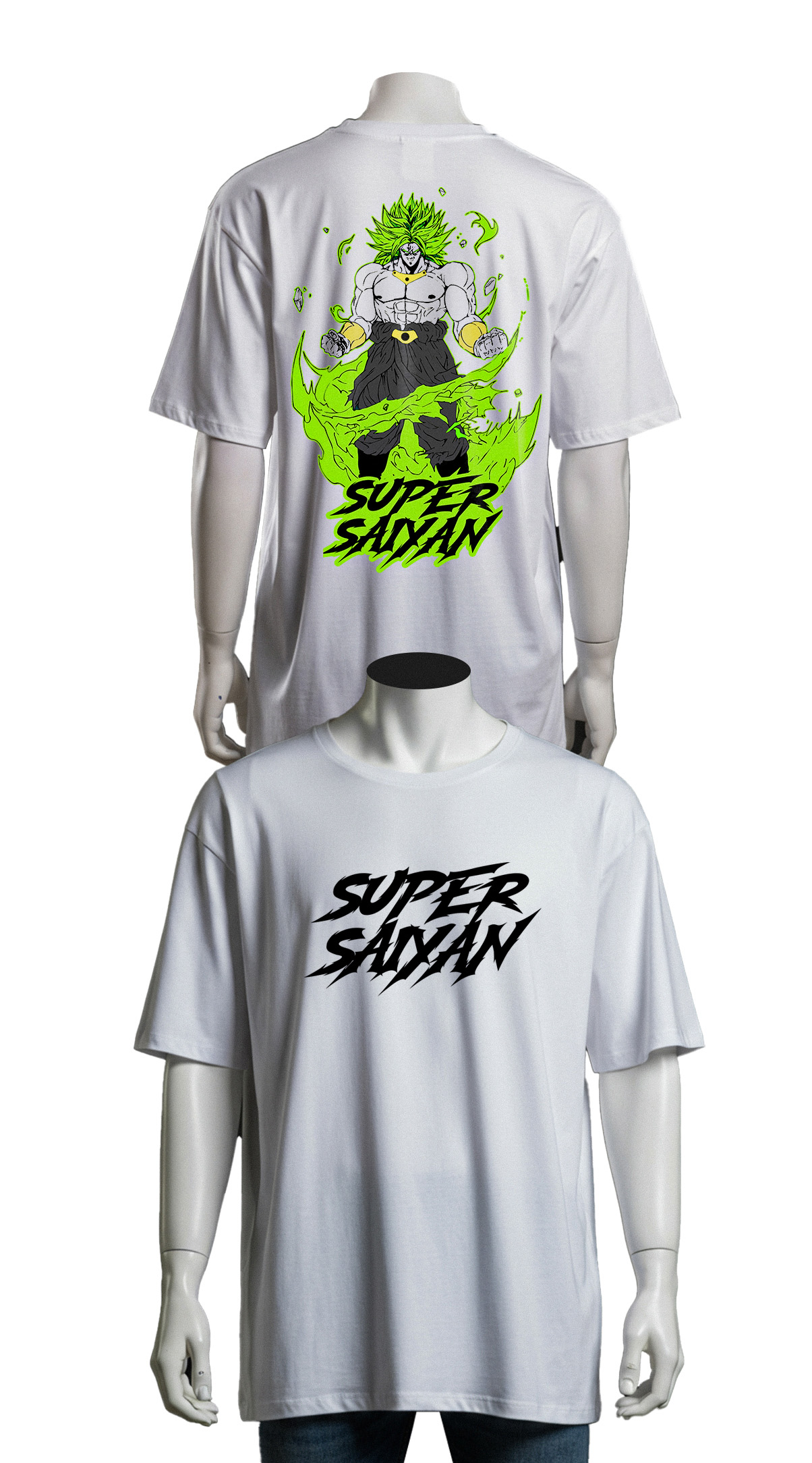 Oversized anime streetwear tee featuring Broly Super Saiyan graphic back print and bold 'Super Saiyan' front text. Neon green artwork on premium heavyweight cotton.